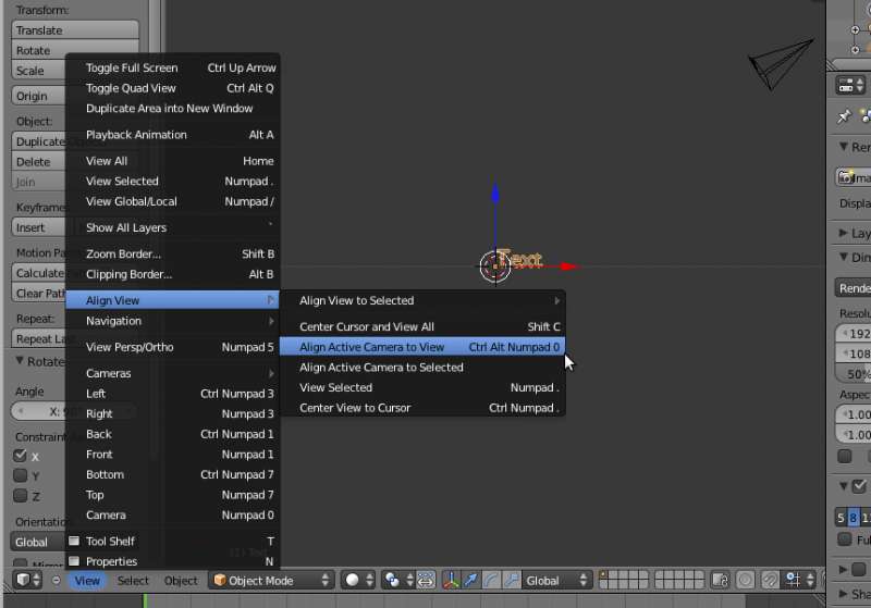 For this great effect, you need Blender 2.62 or newer. Let's start this from scratch! Create a new scene and delete both default cube and lamp. Then hit Shift+A and add a text object. No need to edit it yet, just rotate it by 90 degress around the X-axis (R|X|90). Next let's set up the camera. Hit on the Numpad. This will be our camera perspective. By hitting CTRL+ALT+Numpad 0 aligns with the viewport. You can also use the menu for that: